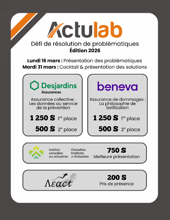 "Desjardins Groupe d’assurances générales a été ravi de s’associer à Actulab depuis sa création et ainsi rapprocher la recherche en entreprise du milieu universitaire. Pour DGAG, ce fut une superbe opportunité de mettre en pratiques les principes d’innovation ouverte. Dès notre premier Actulab, nous avons été impressionnés par la passion et le dévouement des participants ainsi que par la qualité des solutions proposées à des problématiques concrètes que nous rencontrons. Ce fut aussi une belle occasion de donner de la visibilité à la recherche en assurance IARD et un excellent levier de recrutement pour notre entreprise."